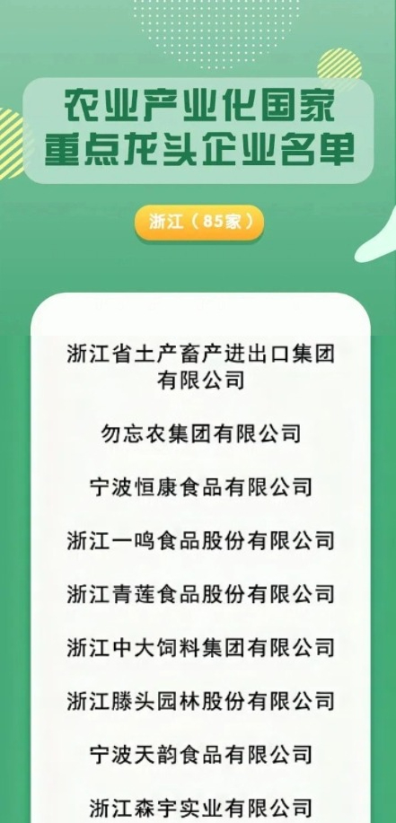 近日,農(nóng)業(yè)農(nóng)村部官網(wǎng)公布了農(nóng)業(yè)產(chǎn)業(yè)化國(guó)家重點(diǎn)龍頭企業(yè)名單,全國(guó)共有2250家企業(yè)成功入圍。其中,浙江85家,浙江省土產(chǎn)畜產(chǎn)進(jìn)出口集團(tuán)有限公司在列。