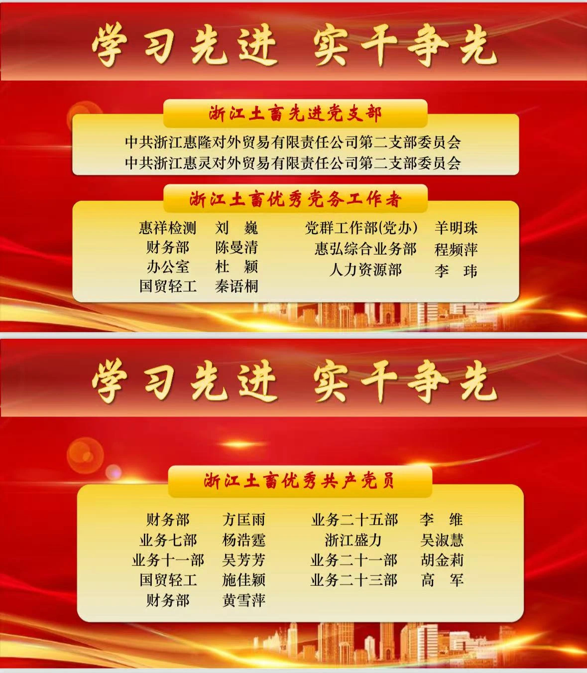 為弘揚(yáng)先進(jìn)、樹立標(biāo)桿,激勵公司各黨支部和廣大黨員見賢思齊、奮勇爭先,浙江土畜黨委決定,對公司先進(jìn)黨支部、優(yōu)秀共產(chǎn)黨員和優(yōu)秀黨務(wù)工作者予以表彰。希望公司各黨支部和全體共產(chǎn)黨員,要以受到表彰的先進(jìn)典型為榜樣,學(xué)習(xí)他們堅守信仰、對黨忠誠的政治本色,學(xué)習(xí)他們開拓市場、服務(wù)大局的闖關(guān)精神,學(xué)習(xí)他們深耕主業(yè)、精益求精的務(wù)實作風(fēng),學(xué)習(xí)他們遵規(guī)守紀(jì)、清正廉潔的職業(yè)操守。要大力傳承和發(fā)揚(yáng)土畜人“實干”的優(yōu)良傳統(tǒng),將榜樣的力量轉(zhuǎn)化為攻堅克難、再創(chuàng)佳績的強(qiáng)大動力,為奮力譜寫浙江土畜高質(zhì)量發(fā)展新篇章展現(xiàn)更大作為,貢獻(xiàn)更多智慧和力量。