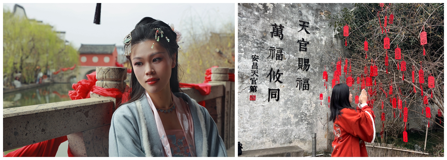 安昌古鎮(zhèn)素有“碧水貫街千萬居,彩虹跨河十七橋”之美譽。大家或穿漢服、或著國風服飾,倚橋遠眺,執(zhí)扇輕笑,徜徉于古街之上,看古橋、古纖道,感受典型的江南水鄉(xiāng)風光。