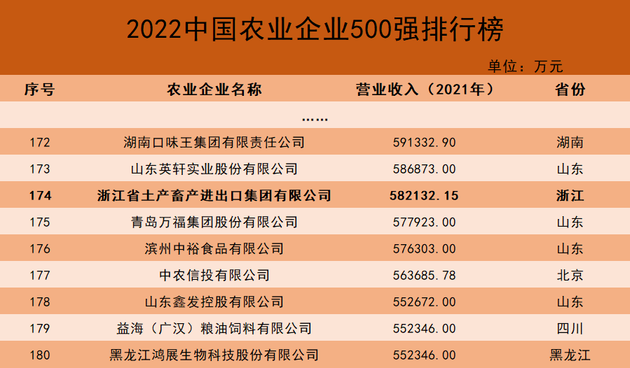12月15日,2022年度中國農(nóng)業(yè)企業(yè)500強(qiáng)榜單發(fā)布,浙江土畜集團(tuán)位列第174位。